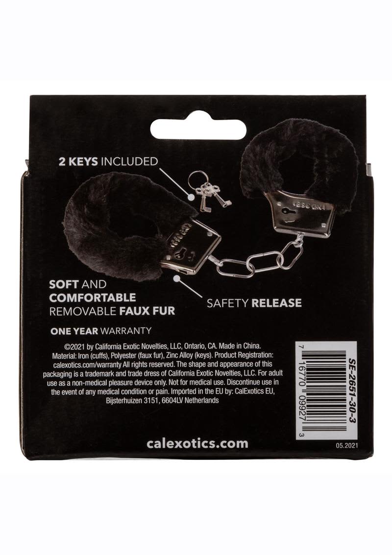 Metal faux fur covered handcuffs with safety release. Soft and comfortable removable faux fur. 2 keys included