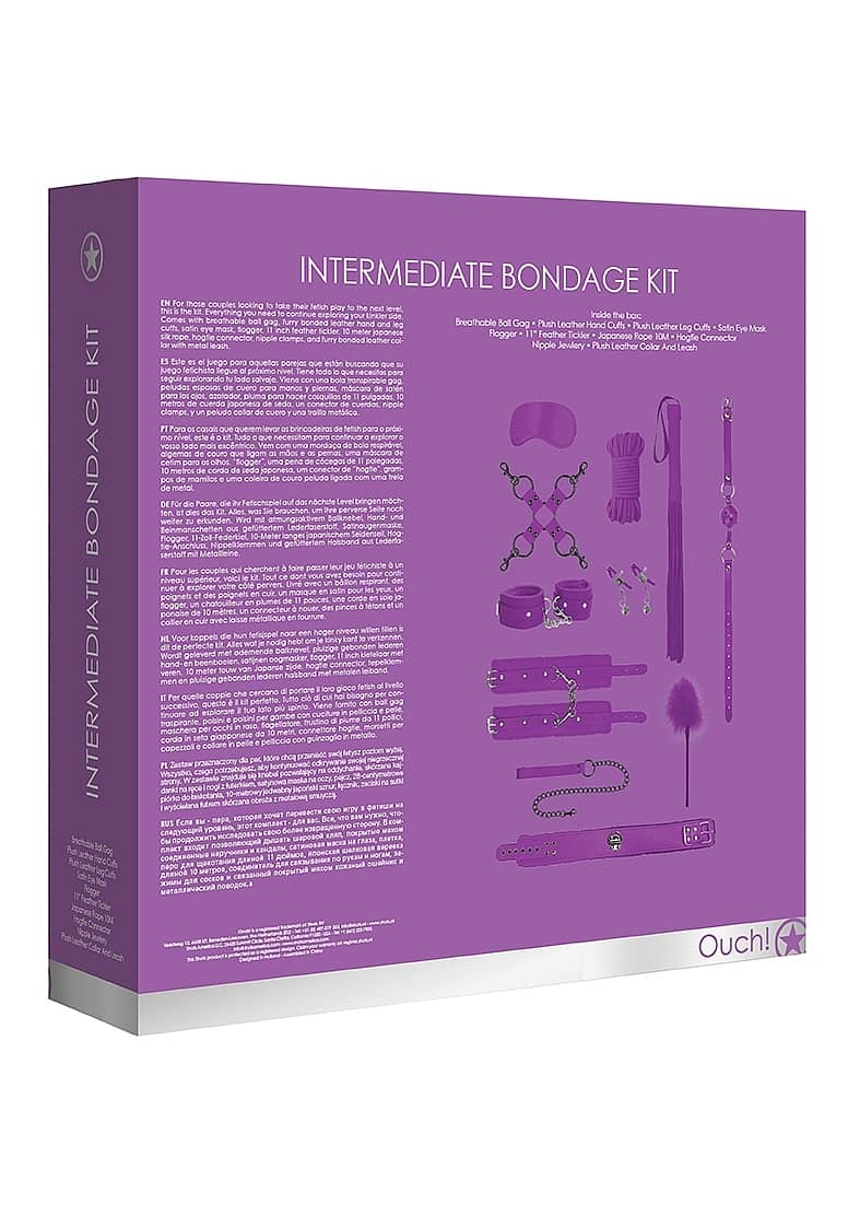 For those couples looking to take their fetish play to the next level, this is the kit. Everything you need to continue exploring your kinkier side. Comes with breathable ball gag, furry bonded leather hand and leg cuffs, satin eye mask, flogger, 11 inch feather tickler, 10 meter japanese silk rope, hogtie connector, nipple clamps, and furry bonded leather collar with metal leash.